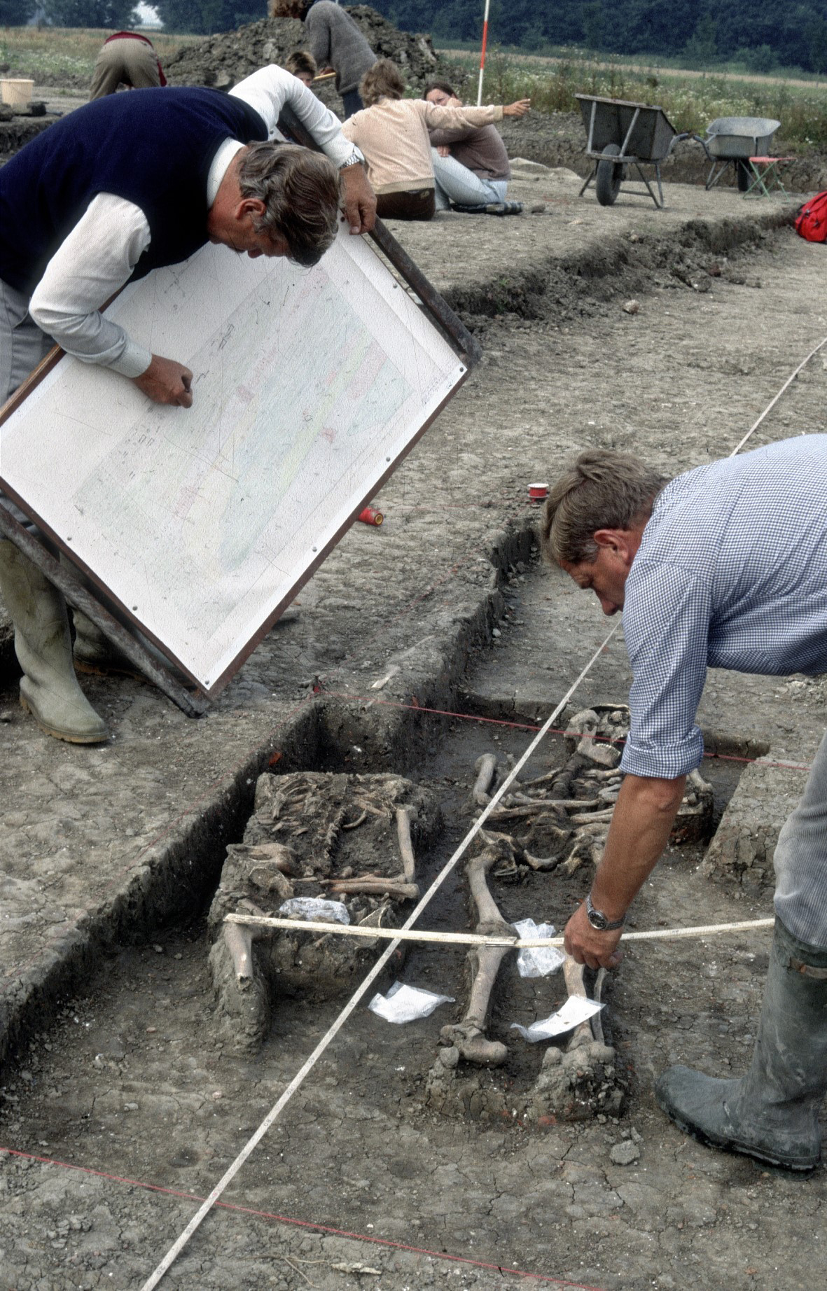 Heveskesklooster, 29-08-1985: werkput 8, Geert Delger (links) en Klaas Klaassens (rechts) tijdens het inmeten van de skeletten van twee kloosterlingen op het kerkhof van de kloosterkerk (skeletten XIII en V). De rode contouren van de kerk kun je zien op de veldtekening. Op de achtergrond zie je Duitse studenten die enige andere skeletten vrijprepareren.