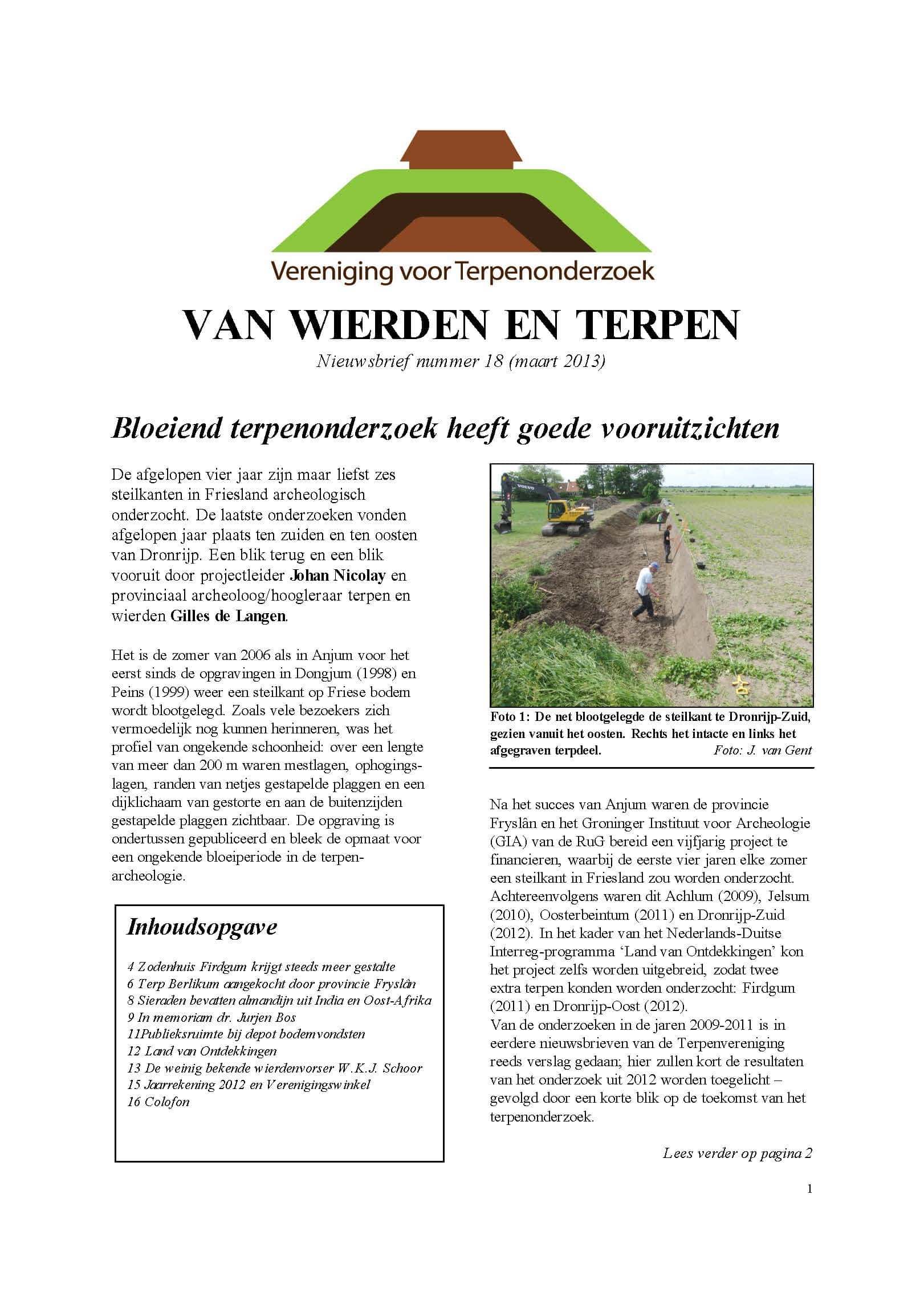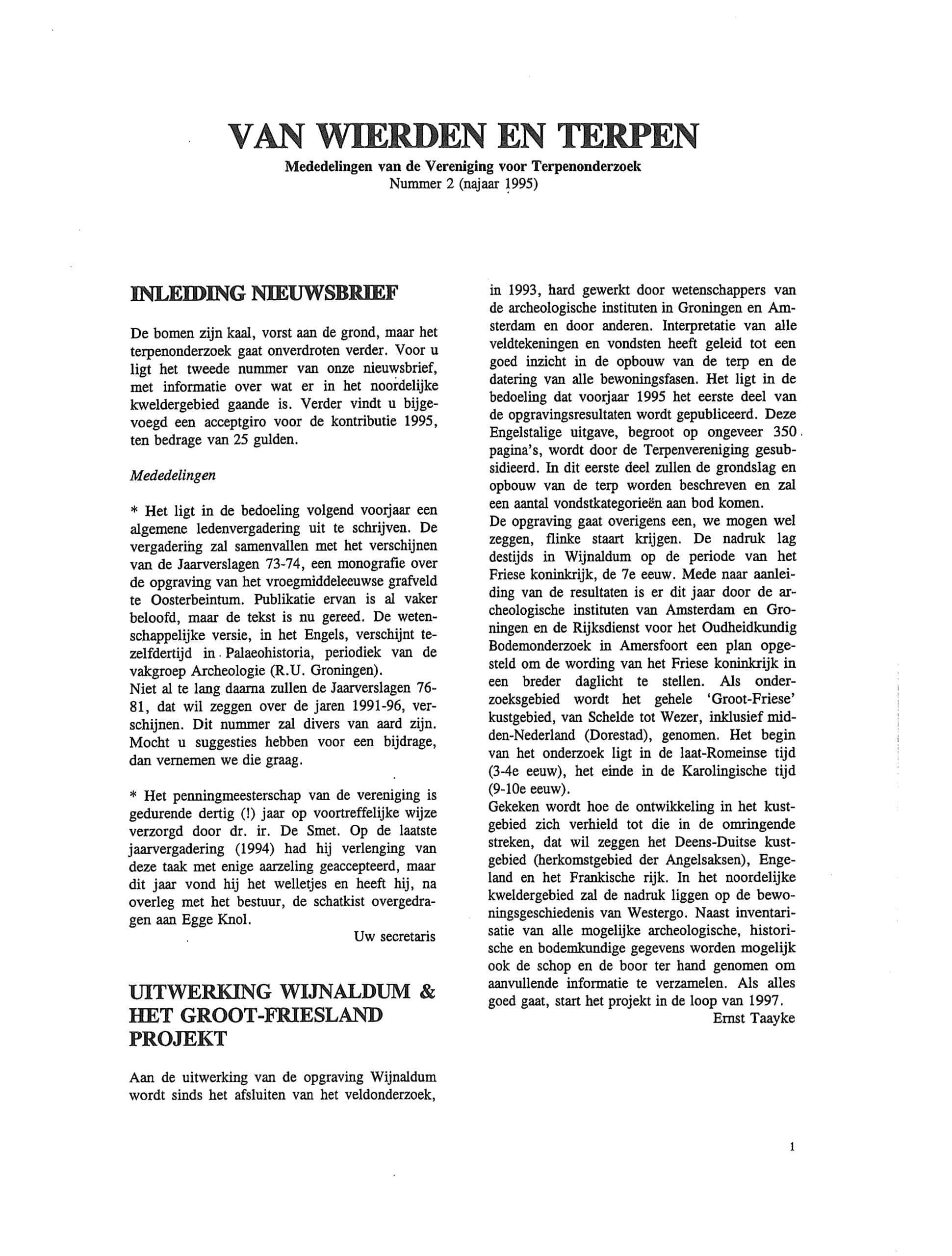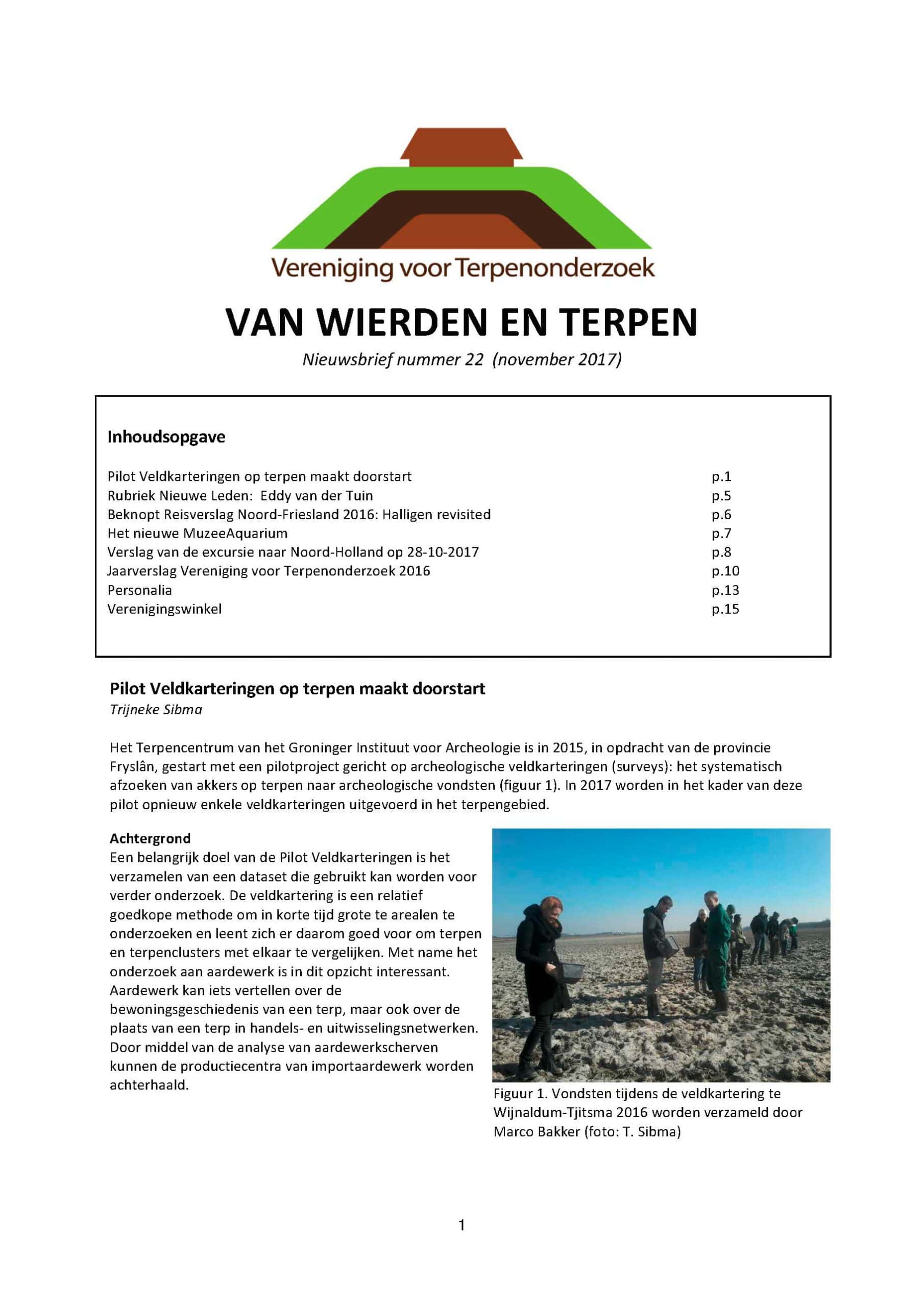 De nieuwsbrief Van Wierden en Terpen, Mededelingen van de Vereniging voor Terpenonderzoek verschijnt een- of tweemaal per jaar. Leden krijgen elk nummer via de post toegezonden. Van deze webpagina zijn de oude nummers te downloaden. Een nieuwe nieuwsbrief kan vanaf zes maanden na het verschijnen door iedereen worden gedownload.